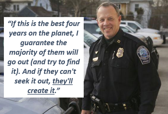 By encouraging, sometimes rowdy, college students to take care of each other and to look to their police department as a resource rather than an adversary, he builds connections and trust among the community he serves.