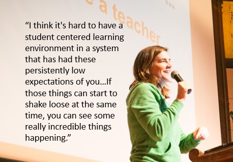 Instead of organizing the school calendar toward content for a test, Dana asks “Is there a way to really reshape and rethink it around student centered learning, rooted in passion that’s rooted in deep learning, that’s rooted in really building skills for independent movement in thinking?”